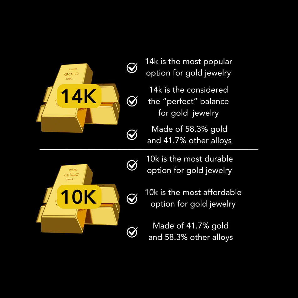 Every item that we make has a proper stamping to verify the gold karat used. This is to ensure the authenticity. Overall, 10k gold is more affordable and durable, while 14k gold offers a richer color and higher gold content. From our experience we only recommend 14k gold for children and people who have sensitive skin.